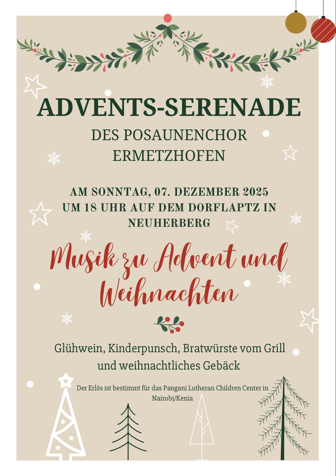 .Glühweinduft, Bratwurst und allerlei weihnachtliche Bastelein... gemischt mit wohlklingender Bläsermusik; das alles hatten der Posaunenchor Ermetzhofen sowie der Freundeskreis des Kindergartens Ermetzhofen bei der diesjährigen Adventsserenade zu bieten. Auf dem Dorfplatz in Neuherberg empfing der Chor viele Zuhörer und bot ein ansprechendes Programm aus Advents- und Weihnachtsliedern, das nicht nur dem herbeigeeilten Nikolaus viel Freude bereitete. Der Posaunenchor bedankt sich ganz herzlich bei den Besuchern, der Erlös ist wie jedes Jahr für das Pangani-Lutheran-Children-Center (PLCC) in Nairobi/Kenia bestimmt.